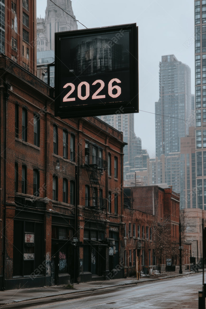 Urban City Streetscape With 2026 Display, Downtown Scene In The City, Concept...
