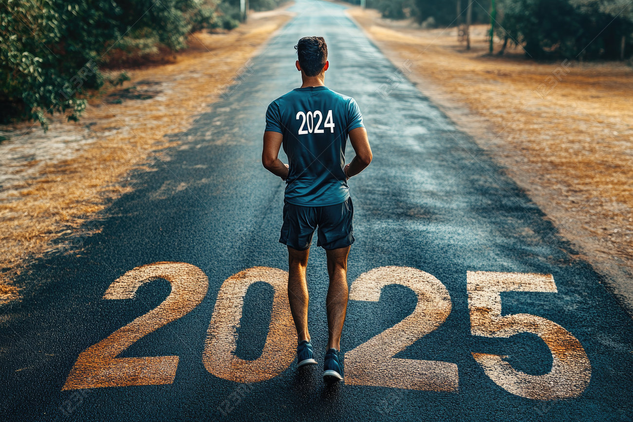 Athlete is walking on a road towards the year 2025 painted on the asphalt, wh...