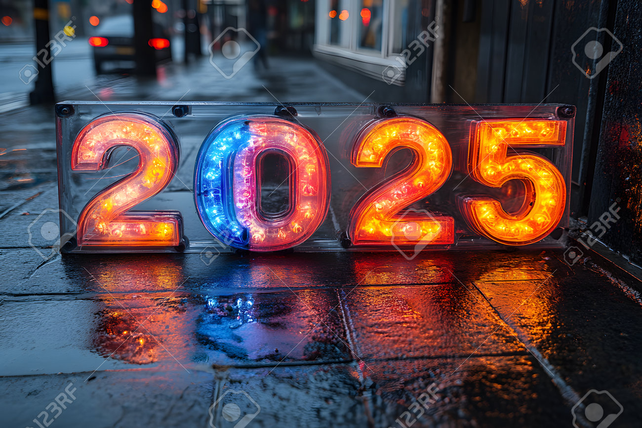 Neon numbers displaying 2025 illuminate a rainy city sidewalk at night, creat...