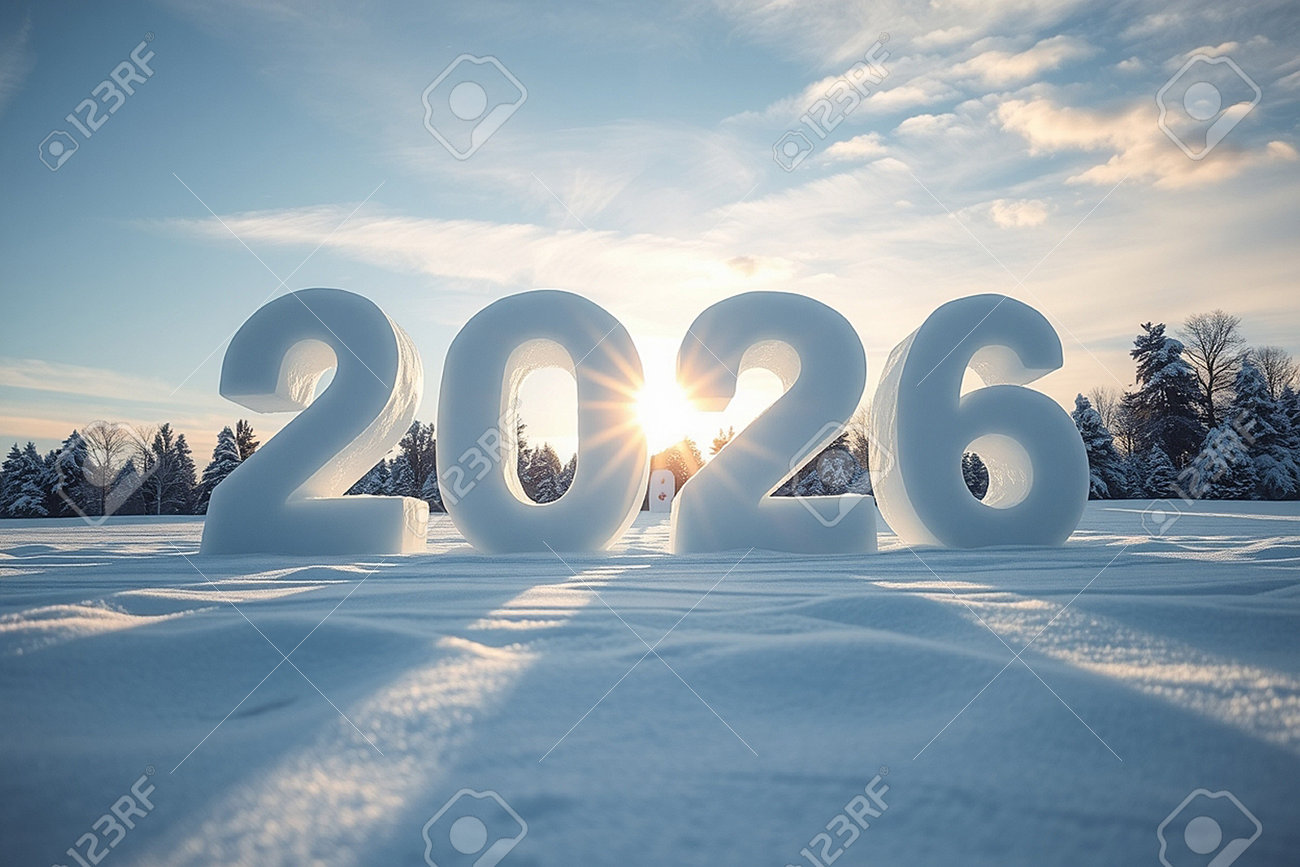 Large ice numbers 2026 stand in a snow-covered field with trees and sunset.